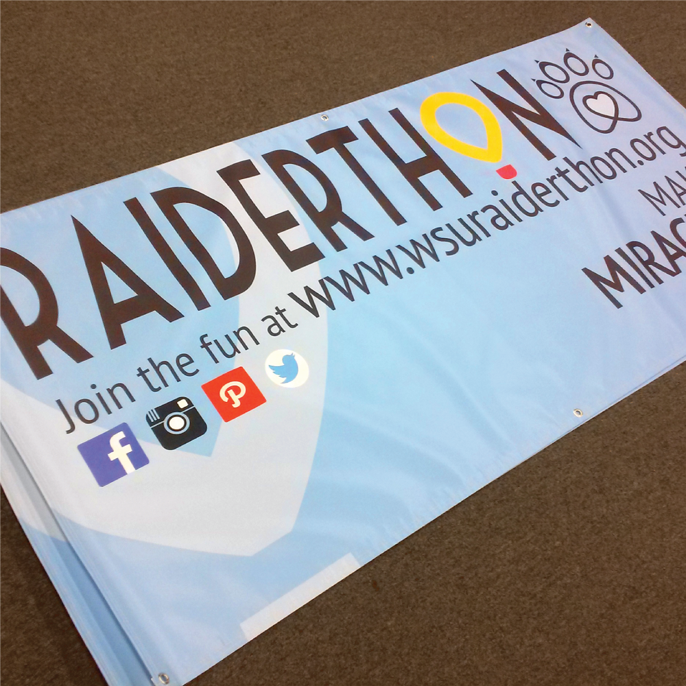 Our standard banner material is 13 oz. scrim vinyl, which is waterproof and durable for both indoor and outdoor use. Grommets and hems come standard. Some of our basic sizes include 2 ft x 4 ft and 3 ft x 6 ft banners. We can accommodate most sizes of custom printed banners in half-foot increments.